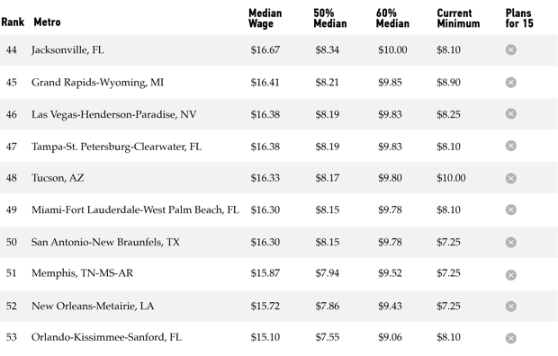 Using median wage data from the Bureau of Labor Statistics, my team and I identified the 50 and 60 percent thresholds for all of America’s 382 metro areas (see the map above). Since there are various ways to calculate median wages, these data are not perfect. Other indexes, including cost of living, are also important to factor in. However, these numbers do give a rough sense of each metro’s ideal rate. The table below shows the current minimum wages for the ten highest-paying large metros in the country compared to 50 and 60 percent of the metro median wage.