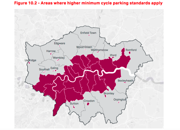 The only road-users who will get new parking are the ones riding bicycles: The plan calls for raised minimum bike space requirements for businesses and a new zone flanking most of the Thames’ banks where even higher minimums will be required for new construction.