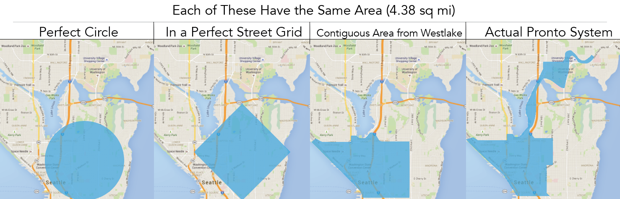 That left Pronto! with a somewhat compromised coverage area. Zach Shaner at Seattle Transit Blog laid out a key principle for system design: “Linearity is the enemy of useful bike share and contiguity is its best friend.” His map below shows us the ideal service area for maximizing station density and what actually happened in the system.